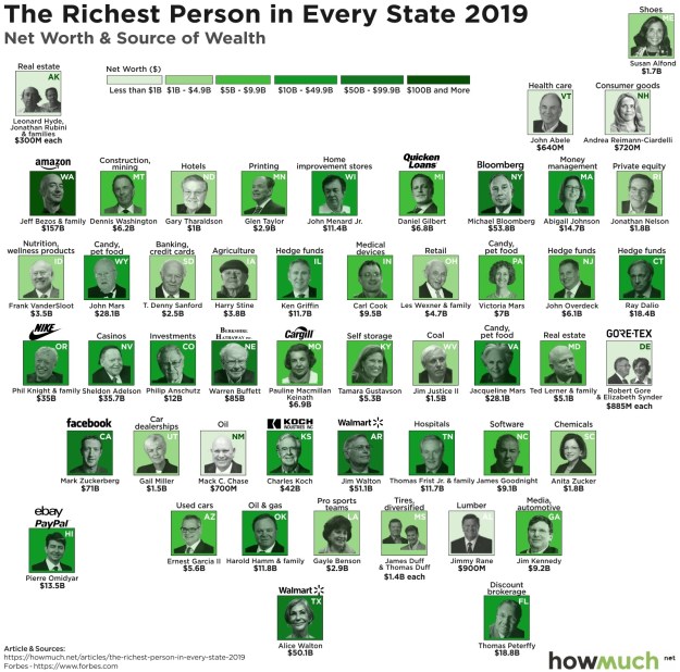 Billionaires — they walk among us — though usually in penthouse villas high above the clouds. As of 2019, there are 607 #billionaires in the United States, but only a select club can say they’ve got the most cheddar in their home states. Who are the richest #tycoons swimming in their gold coins a la Scrooge McDuck in your state? The data viz magicians from HowMuch charted the filthiest of the filthy rich in every state in America.
