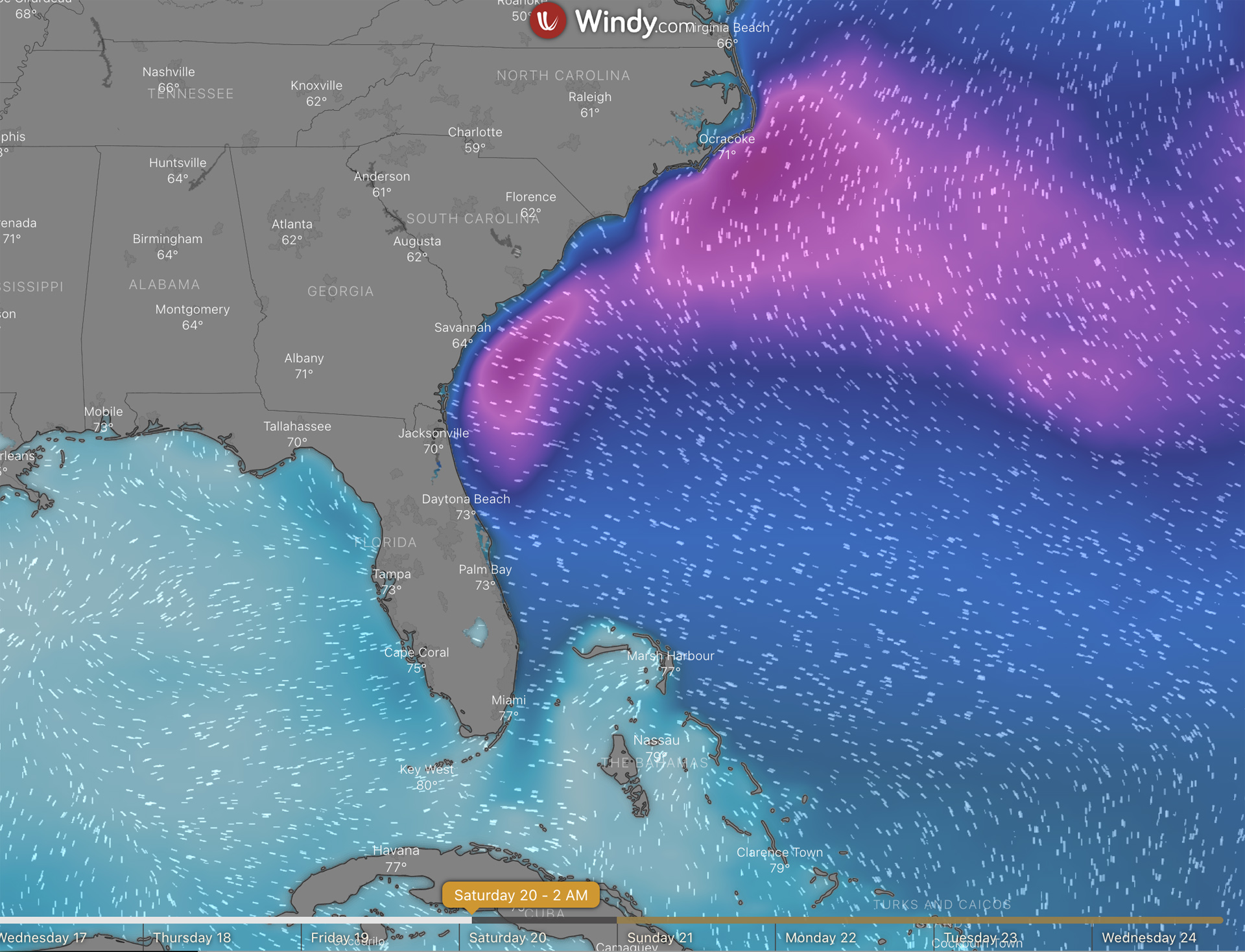 Monday after Mother’s Day and back to work and school. Looking at the forecast maps from Windy and the National Weather Service, there’s a good chance for waves this coming weekend.