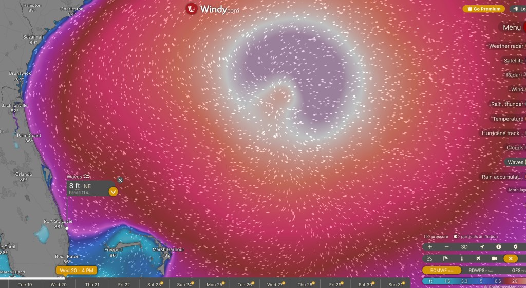 Most of Erin’s effects in Florida will be from Palm Beach County north. But, from the Windy wave forecast, it’s possible to get 5′ – 6′ in mid to southern Palm Beach County.