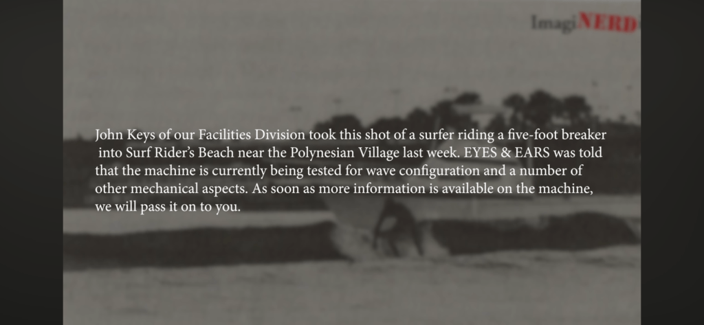 There is only one photo that I’ve found of someone surfing the wave (above). A Disney employee newsletter ran the photo and said it was Dick Nunis surfing in the photo, the Disney executive that came up with the wave machine idea and acquired the $400,000 budget to build it. Might have been him but the newsletter also said it was a 5 ft. wave. That’s a stretch LOL.