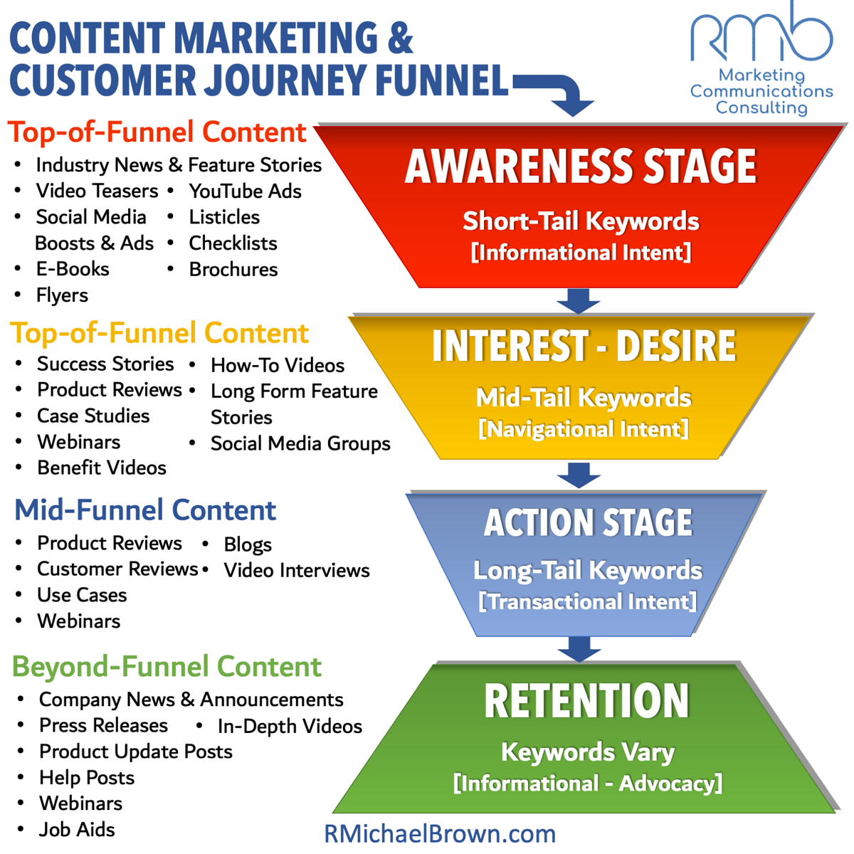 Content marketing is all the rage now. The big questions are, what content, where, and at what stage of the customer buying funnel? So I came up with a Content Marketing and Customer Journey Funnel infographic to help clients and content producers know the content marketing roadmap to success.